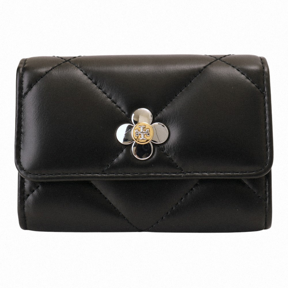 TORY BURCH-三葉草絎縫紋皮革翻蓋卡夾黑