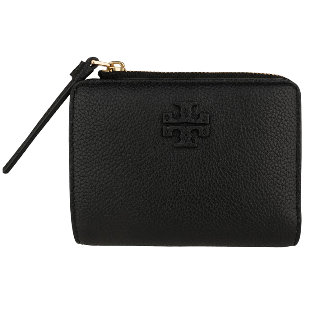 TORY BURCH-皮雕TB皮革拉鍊暗釦短夾黑