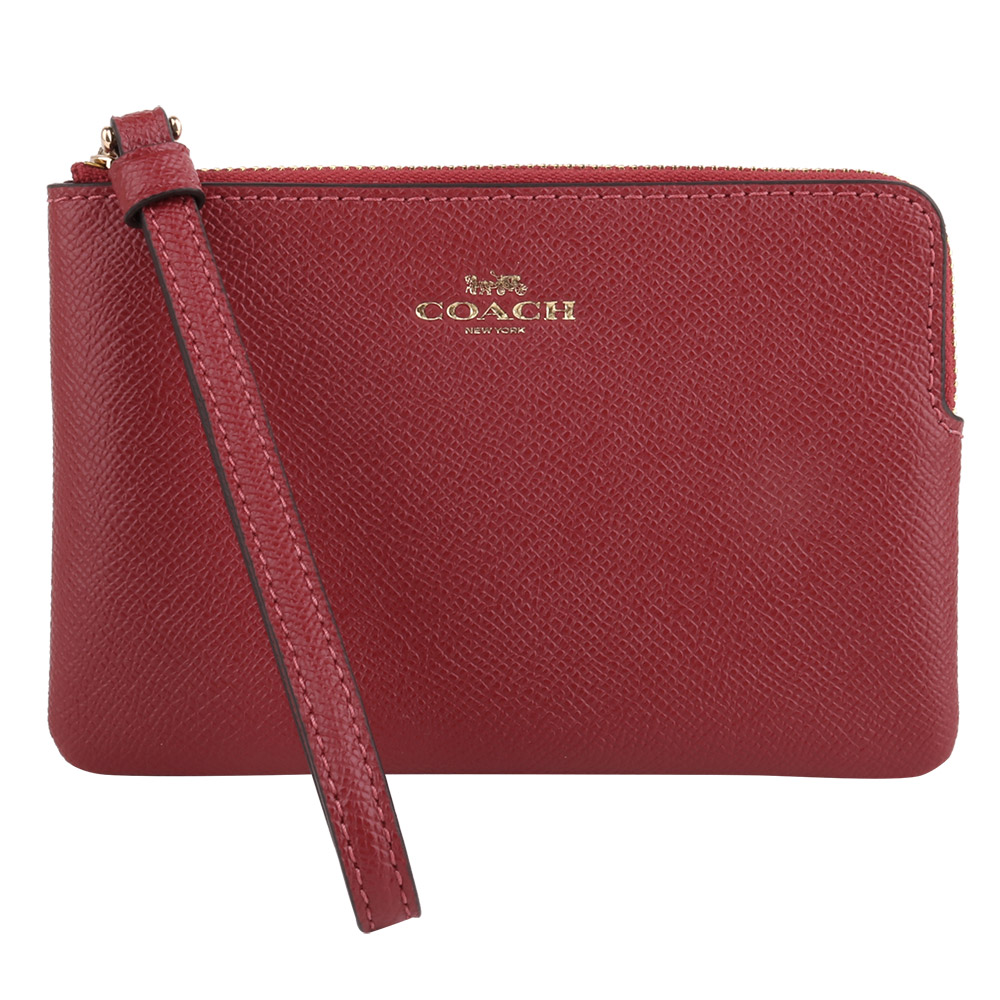 金馬車荔枝紋皮革掛帶拉鍊長夾_深橘紅