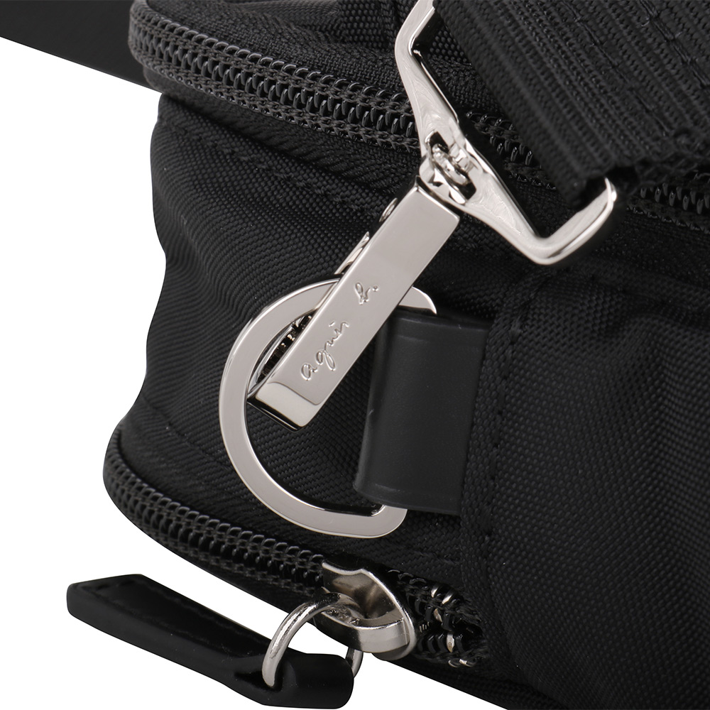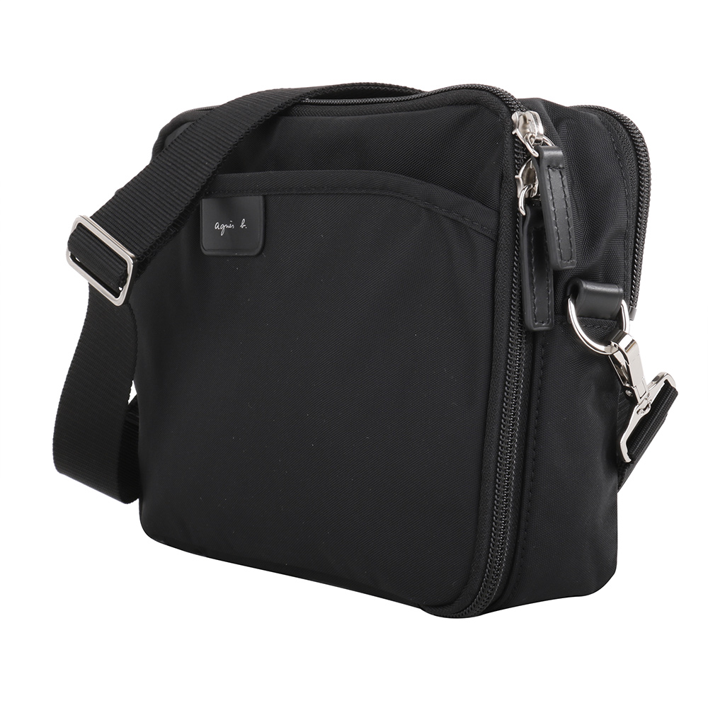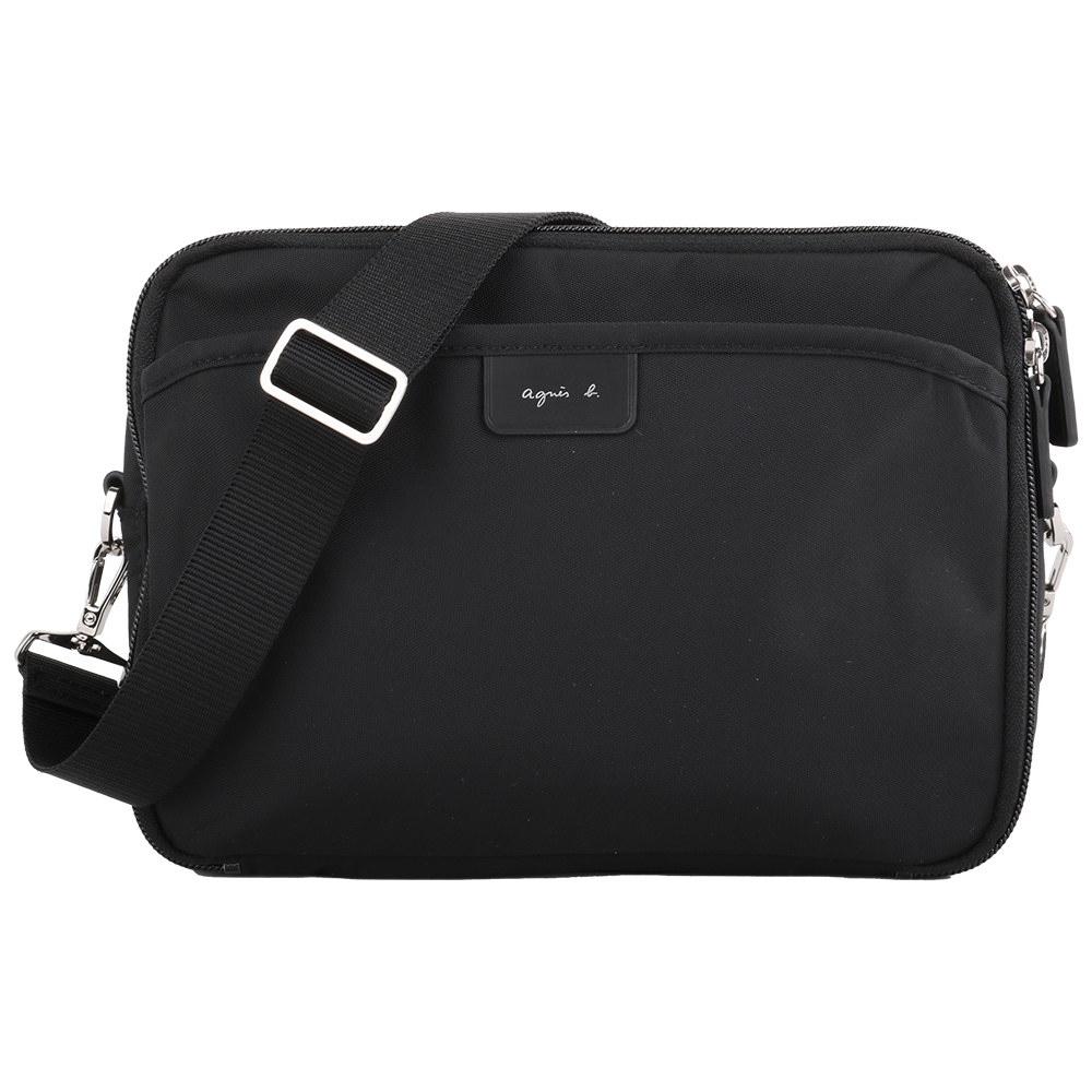 agnes b.草寫皮標前拉鍊尼龍雙層斜背包(黑)小款