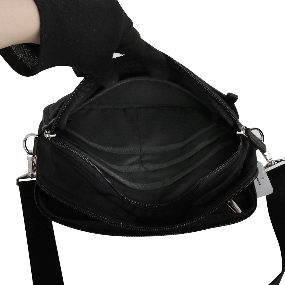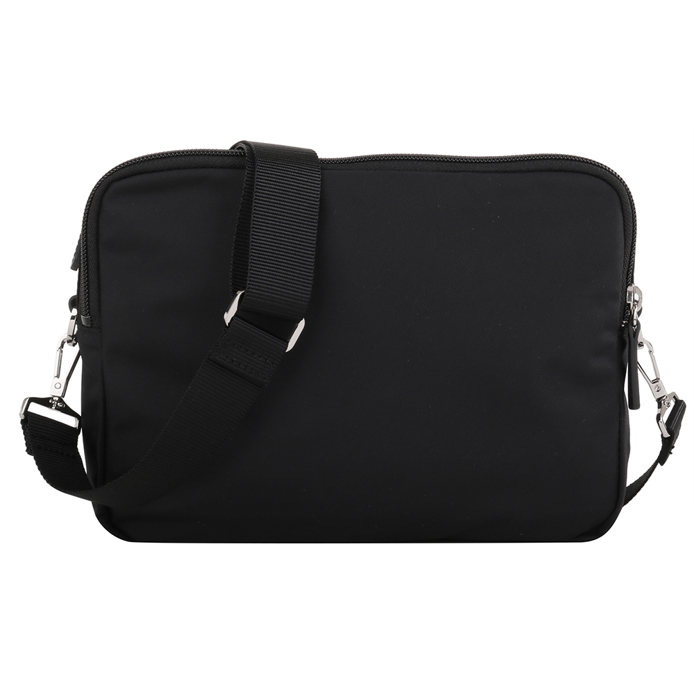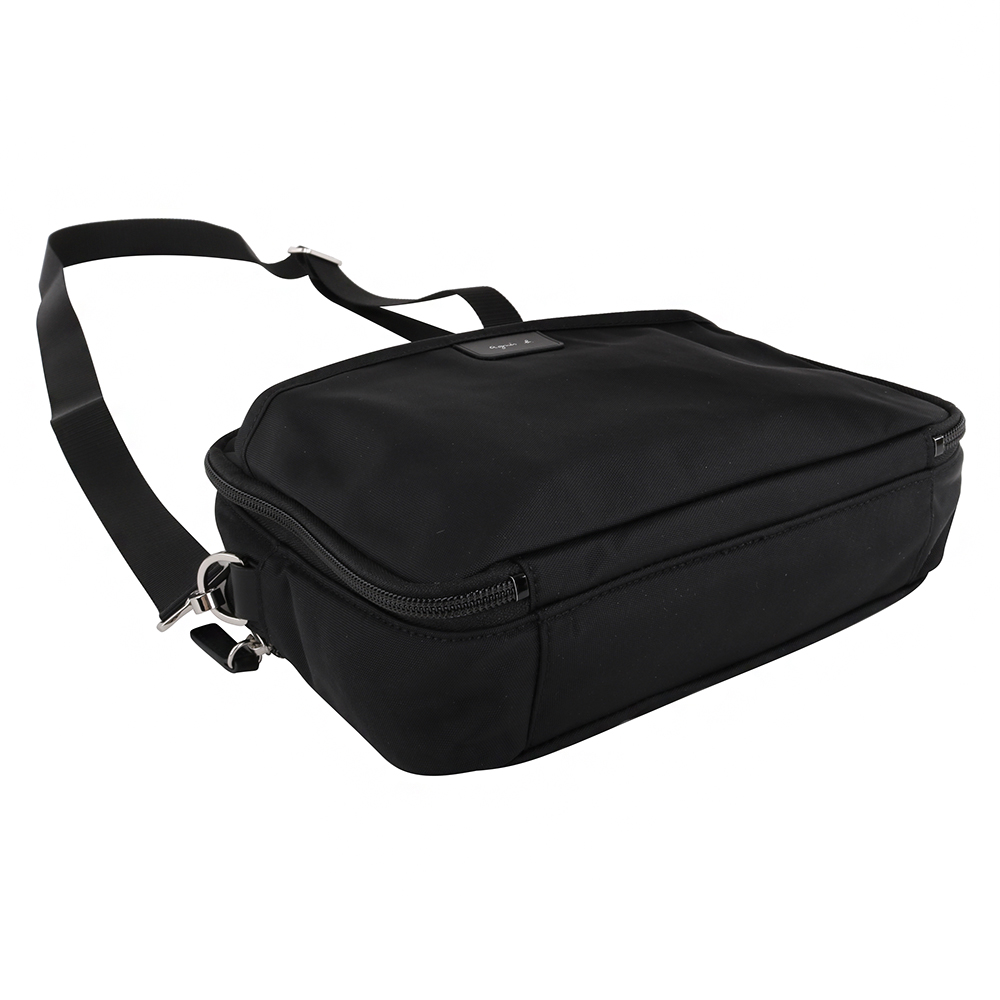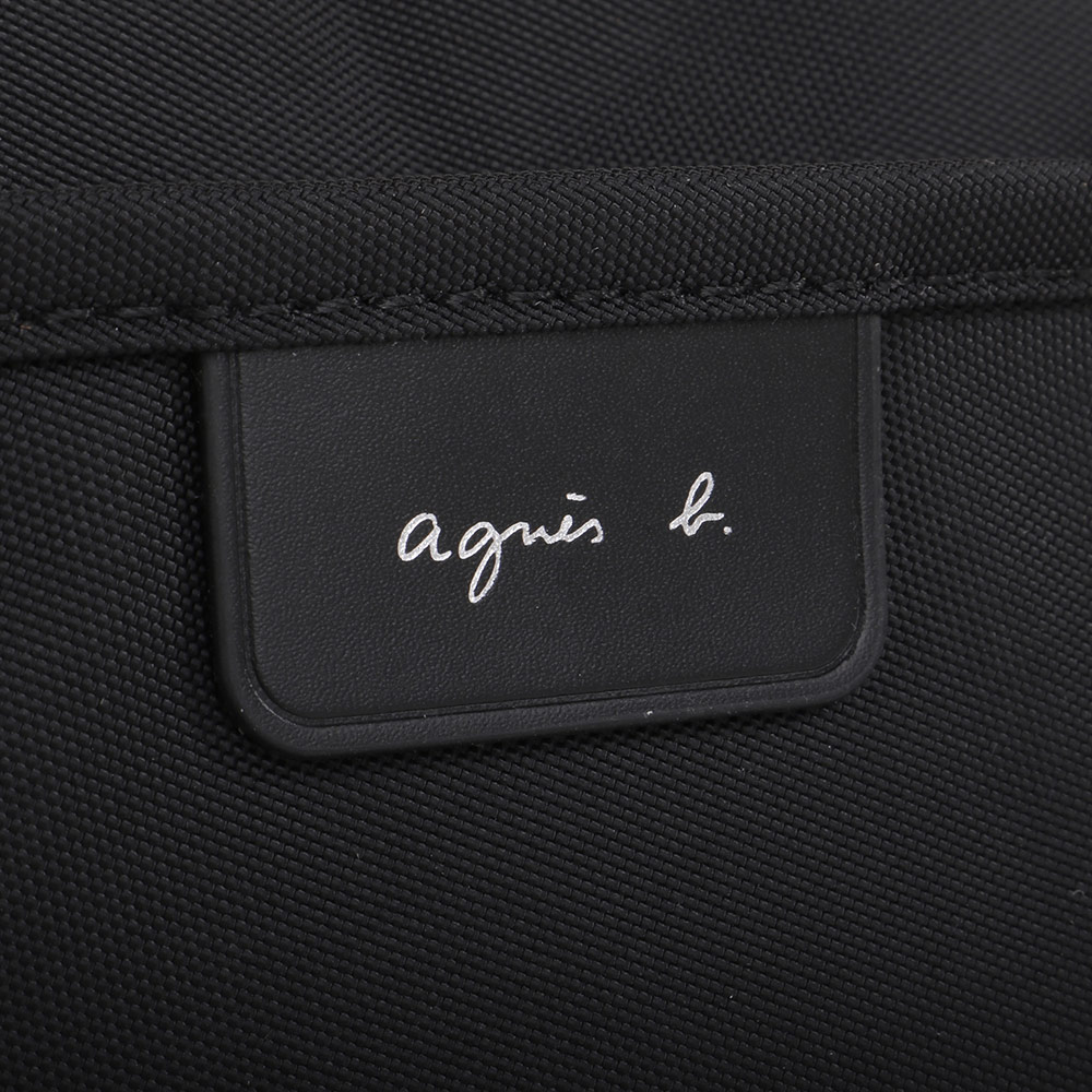 agnes b.草寫皮標前拉鍊尼龍雙層斜背包(黑)小款