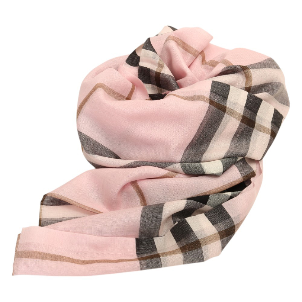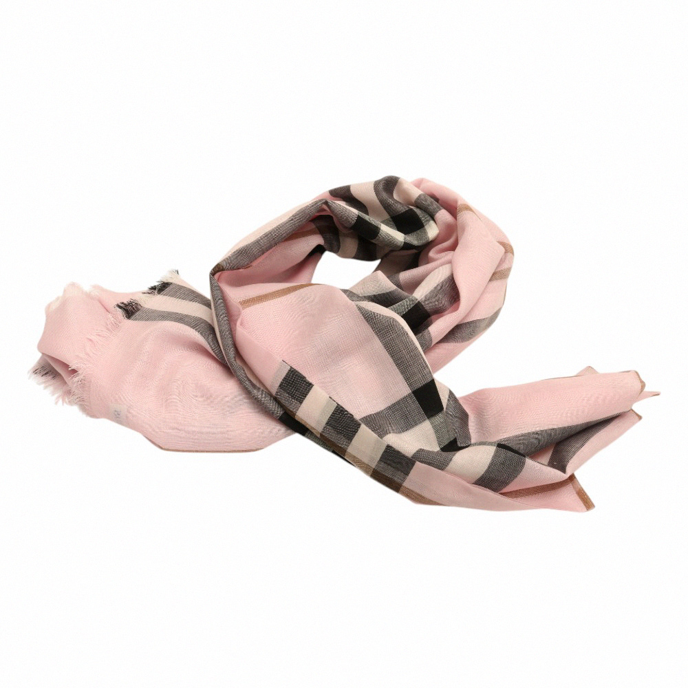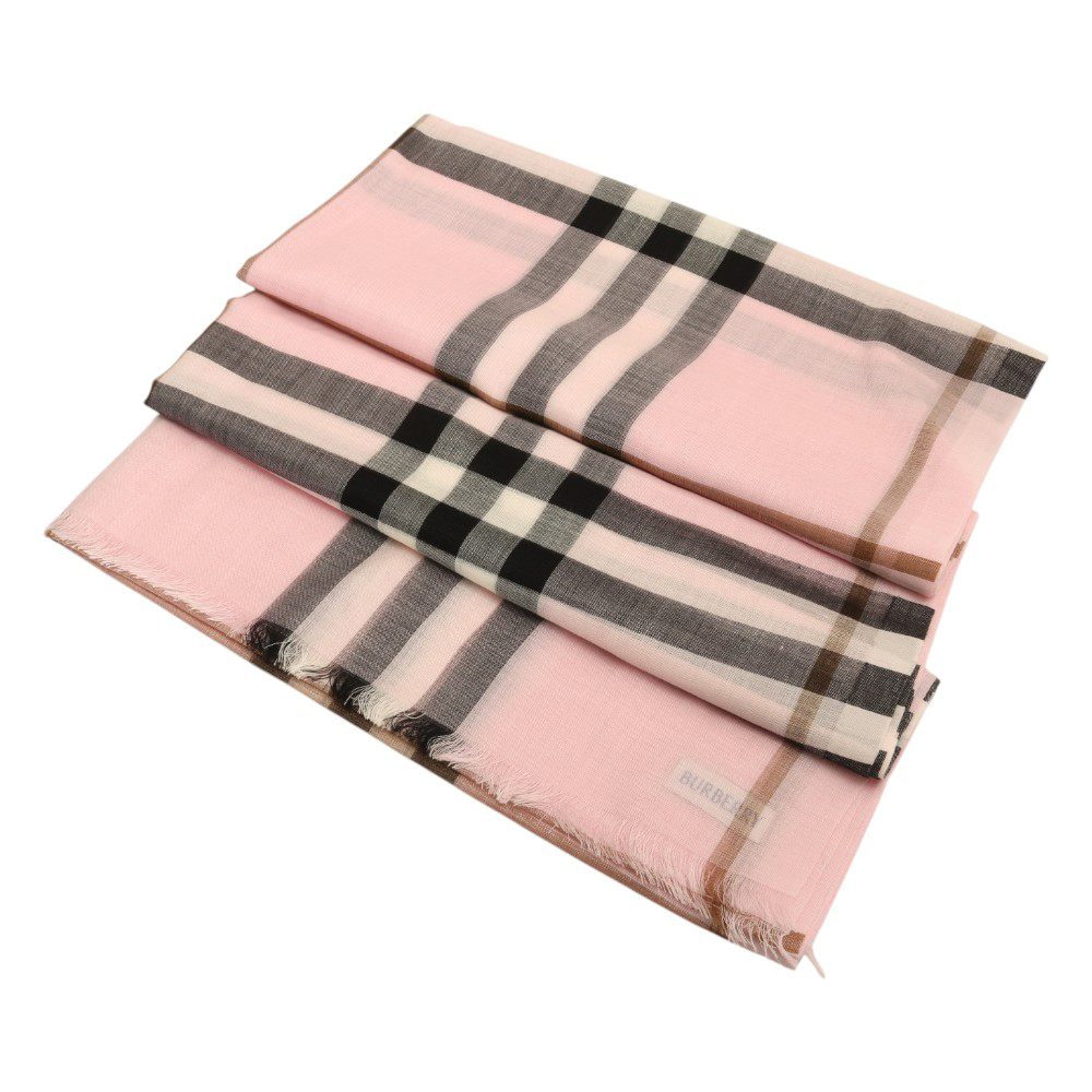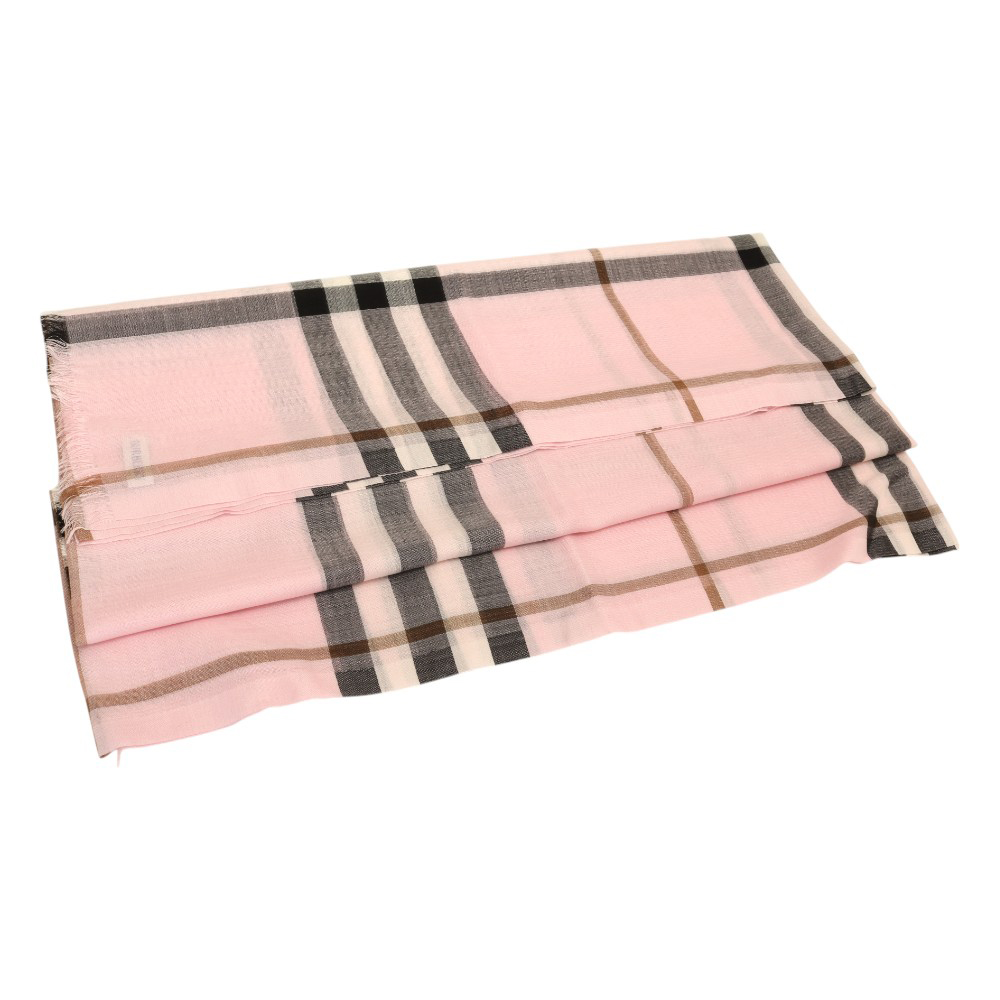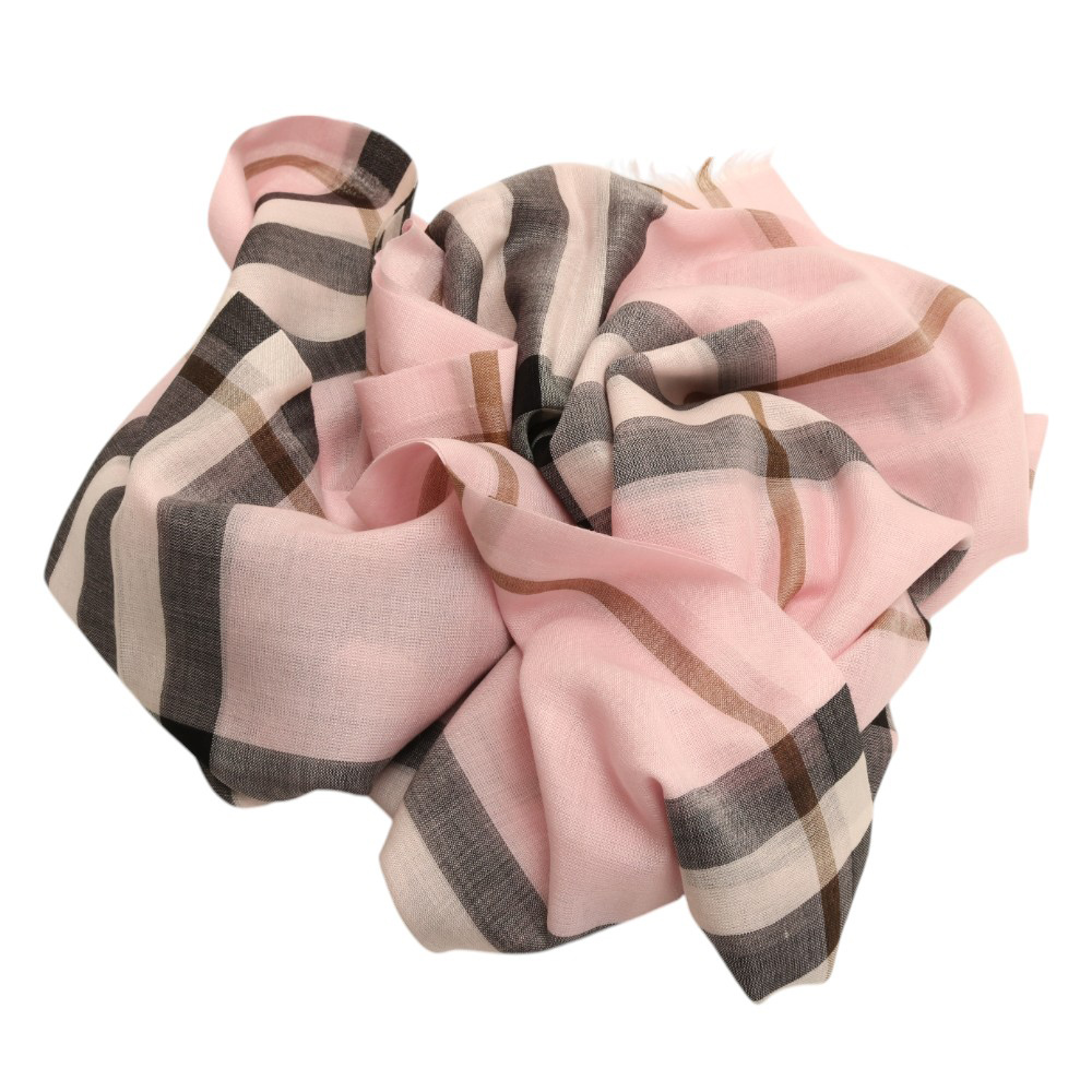 BURBERRY- 混羊蠶絲薄款小流蘇長絲巾(淺粉格)