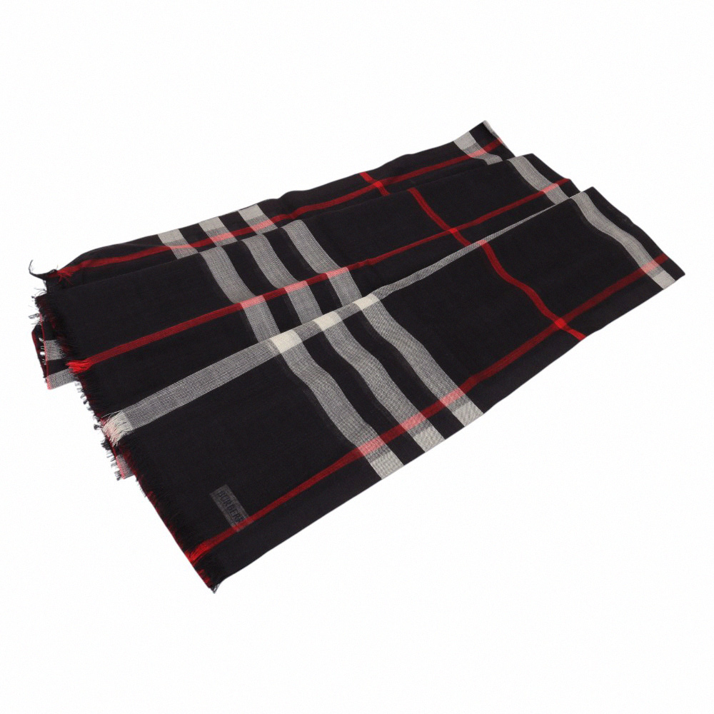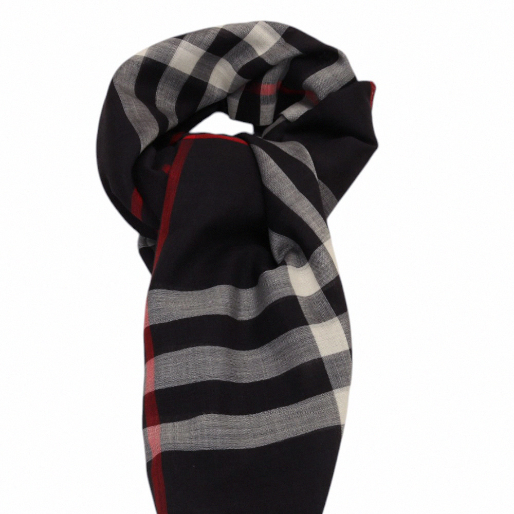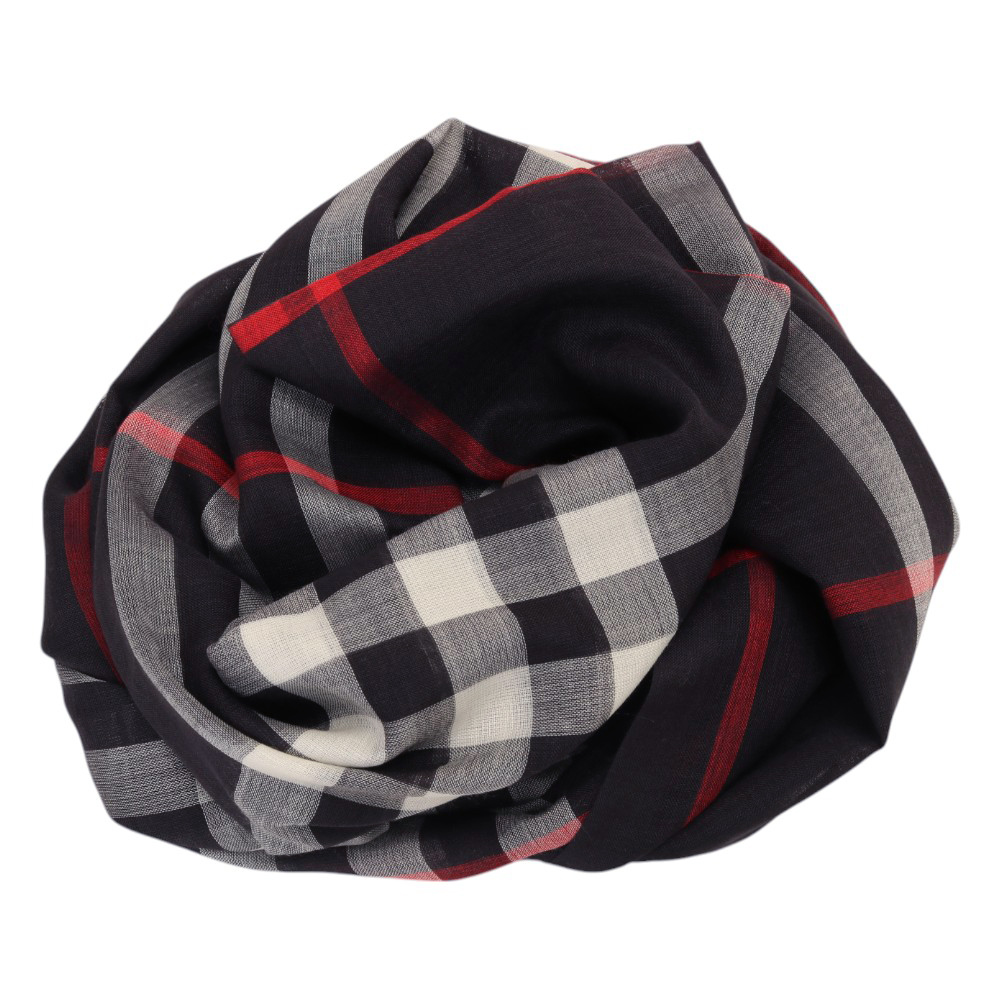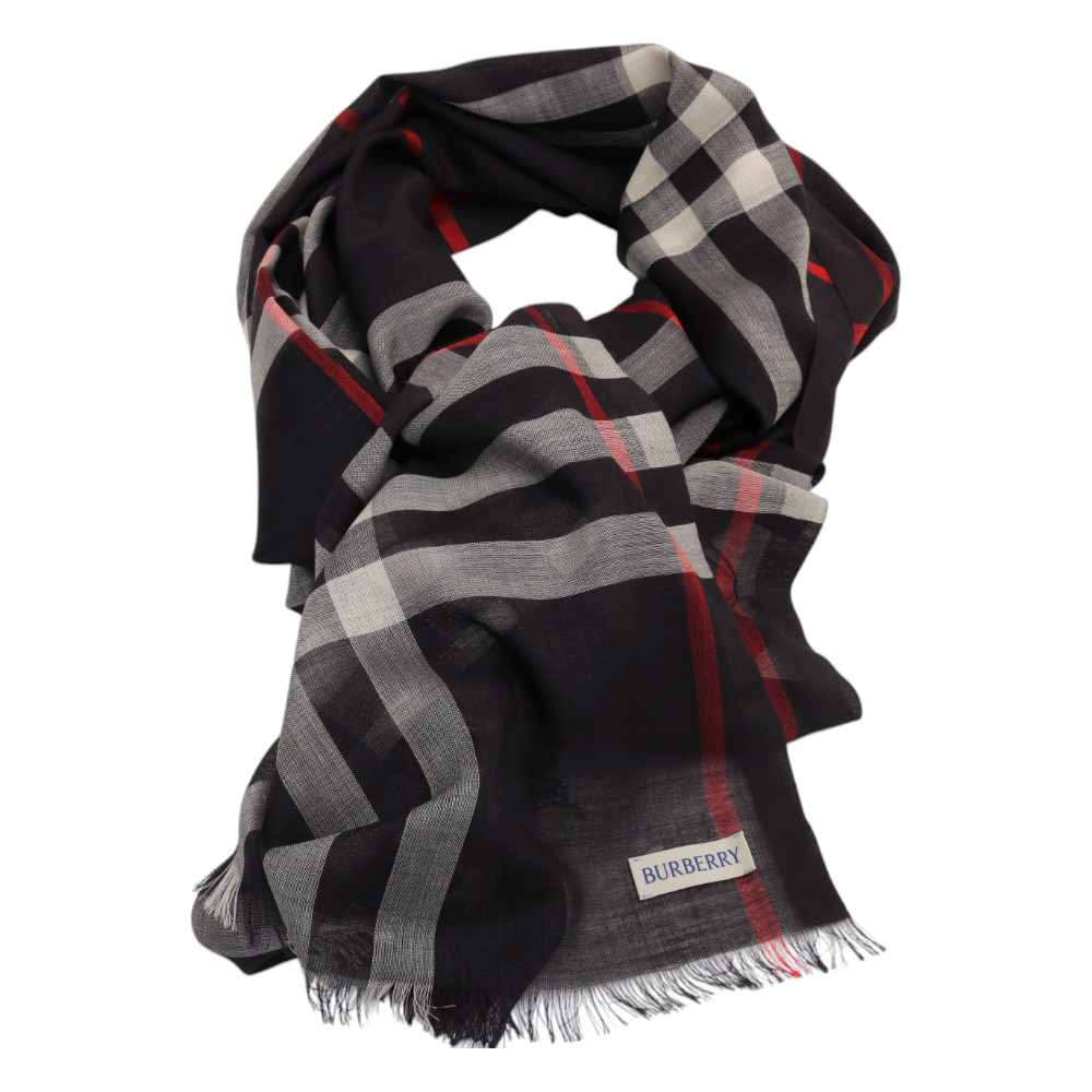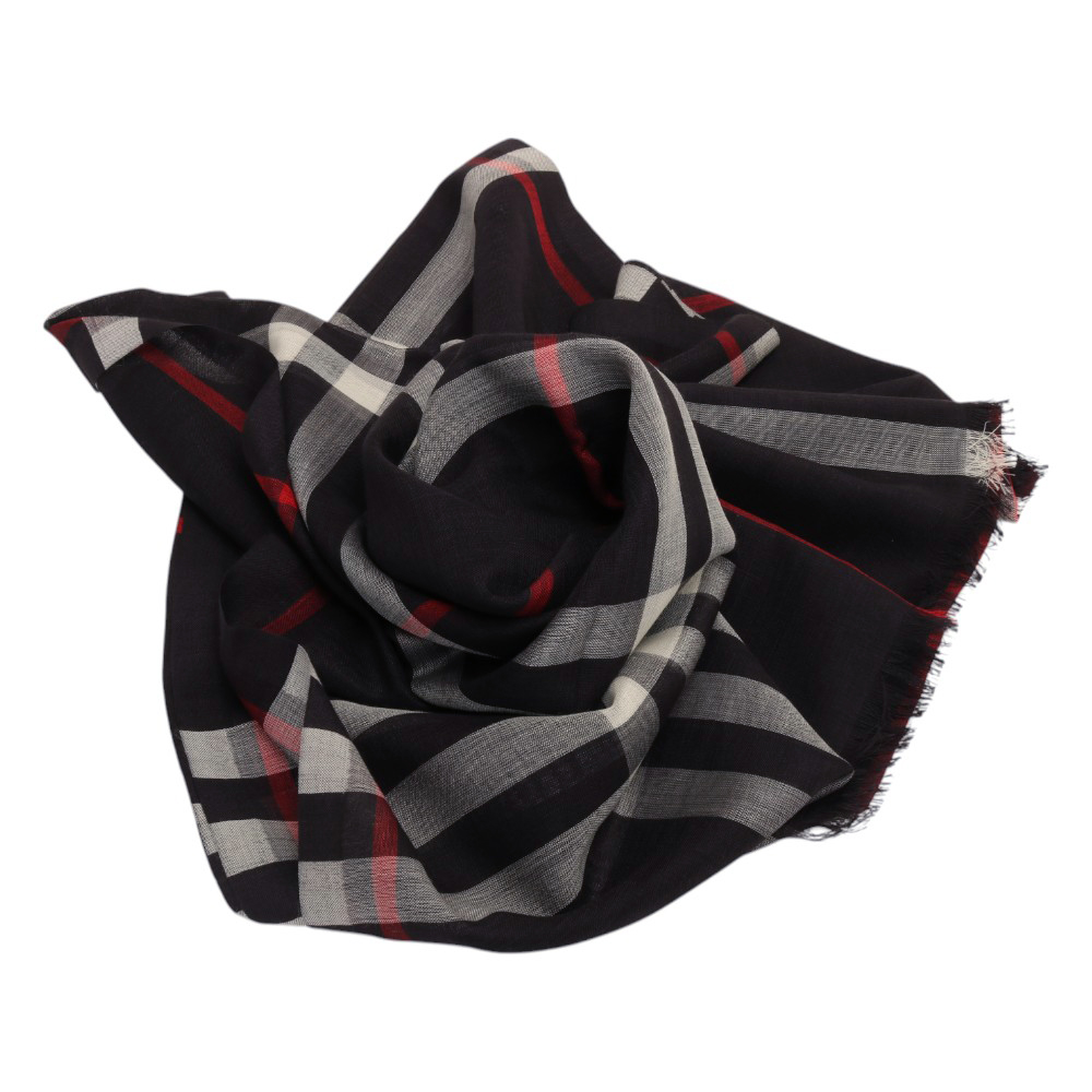BURBERRY- 混羊蠶絲薄款小流蘇長絲巾(藍格)