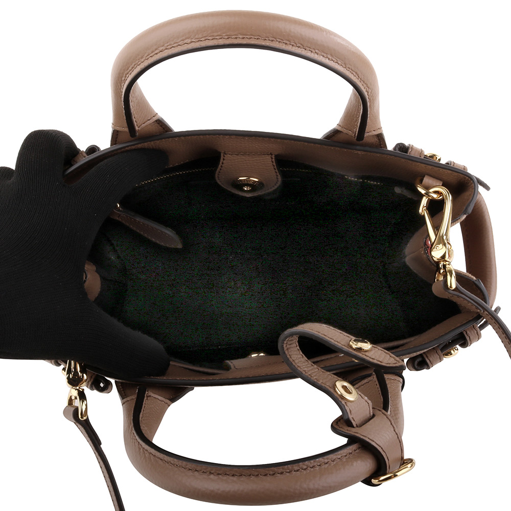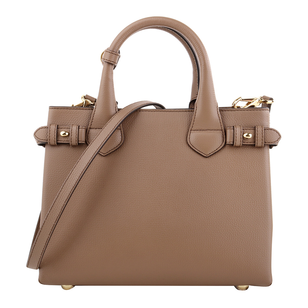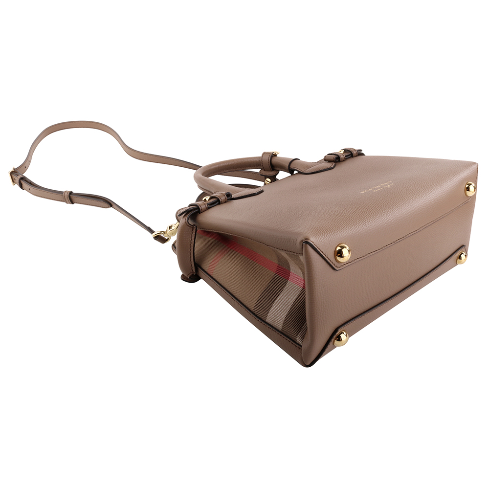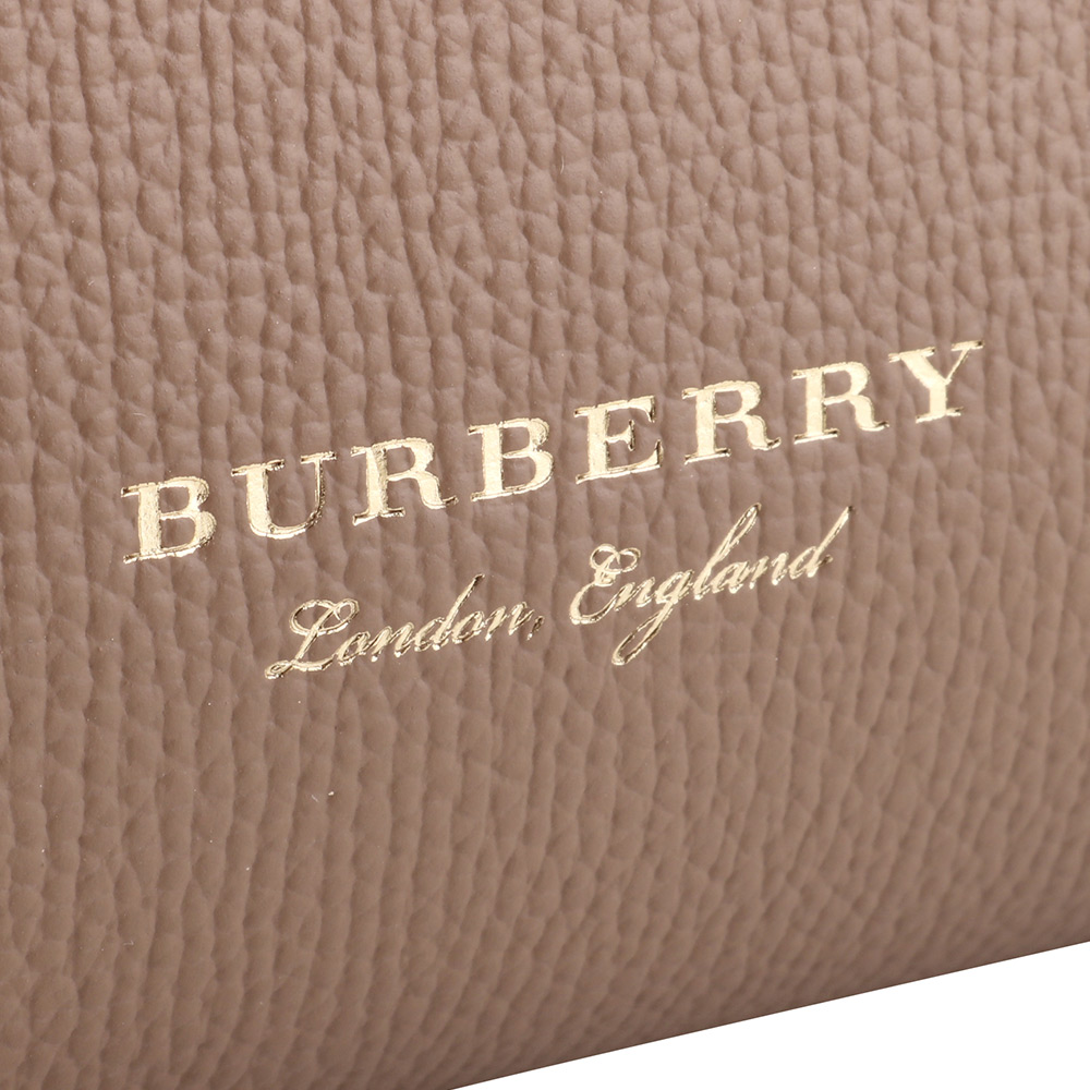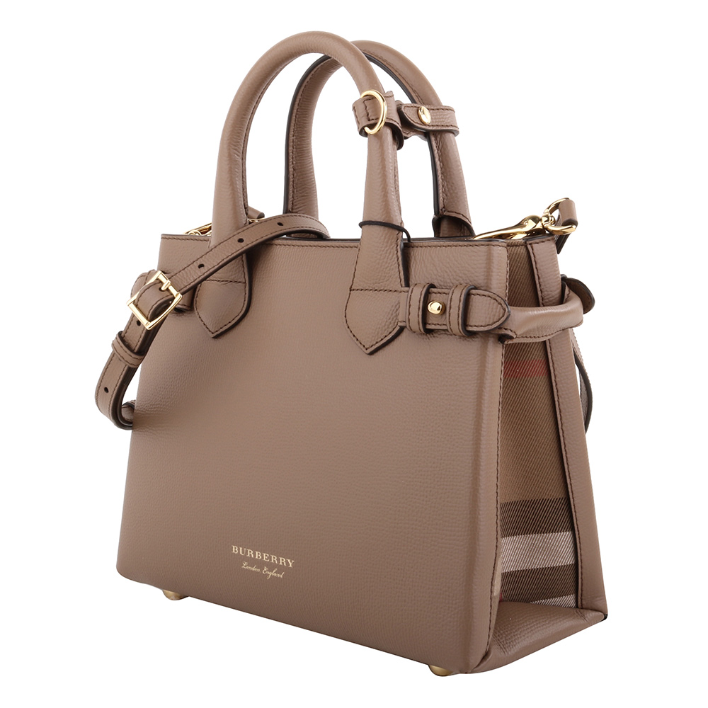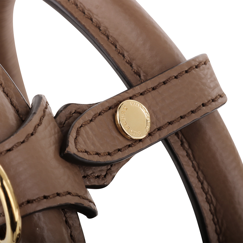 BURBERRY-烙印金字皮革側格紋手提/斜背兩用包(摩卡棕)小