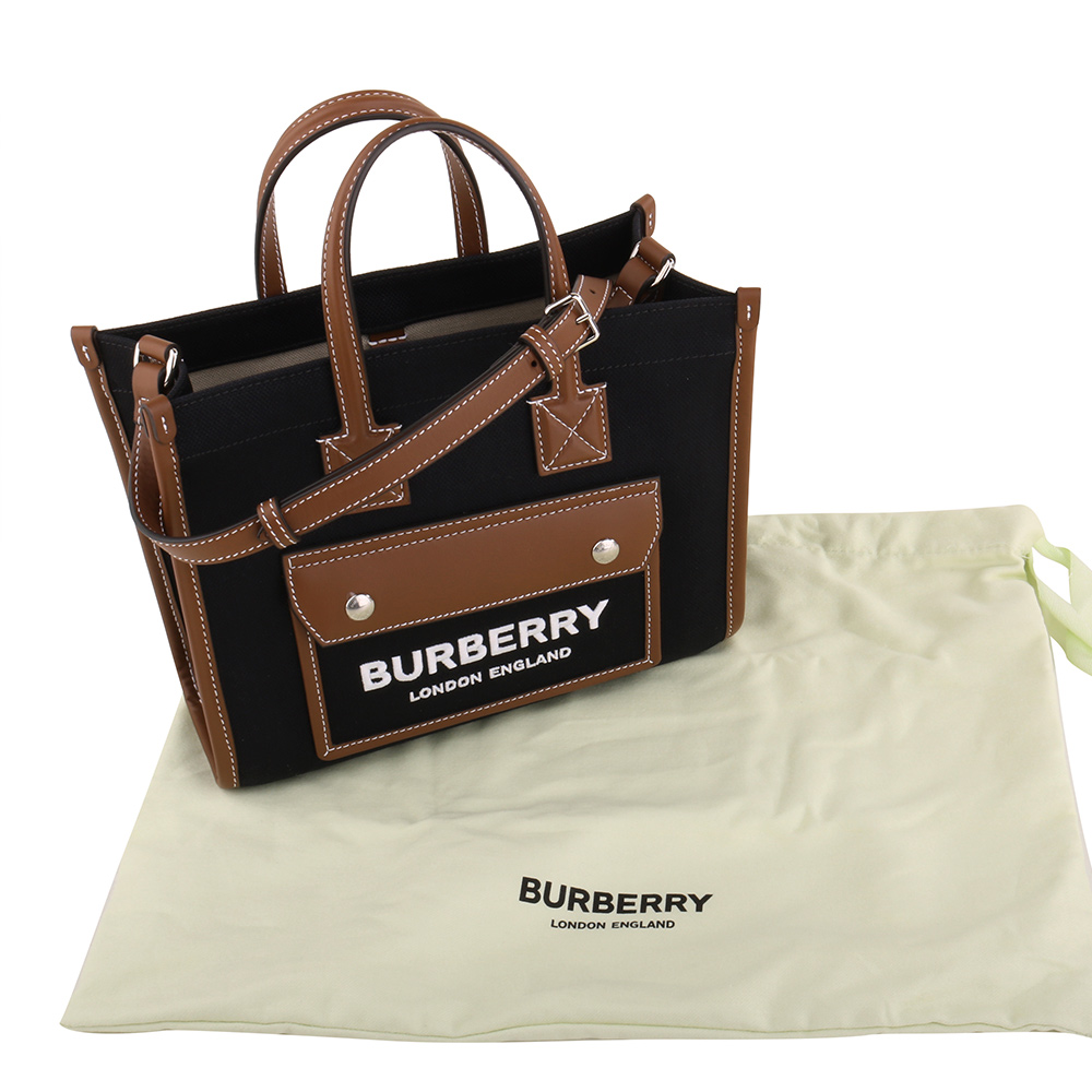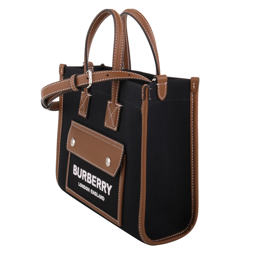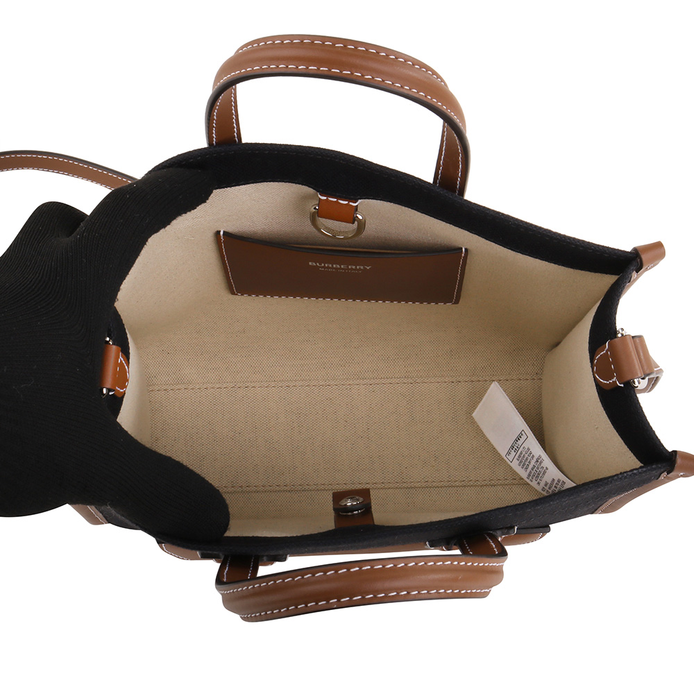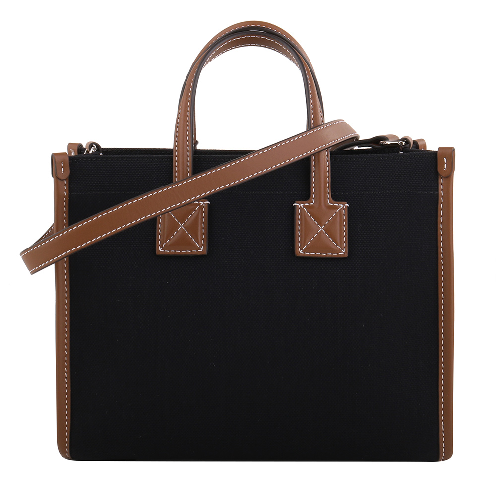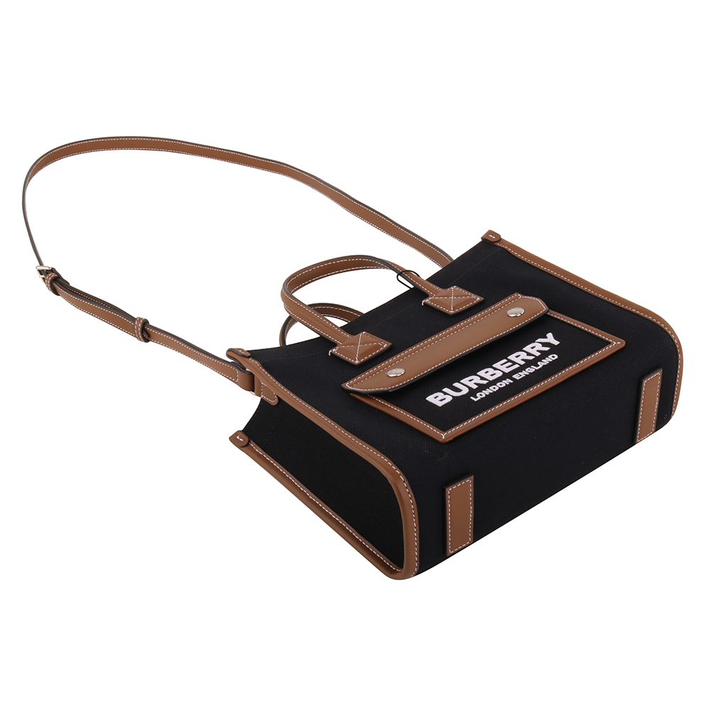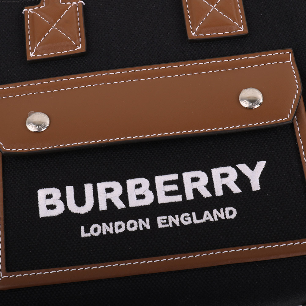 BURBERRY-白繡線字母標誌帆布皮革邊手提/肩背兩用包(黑)小