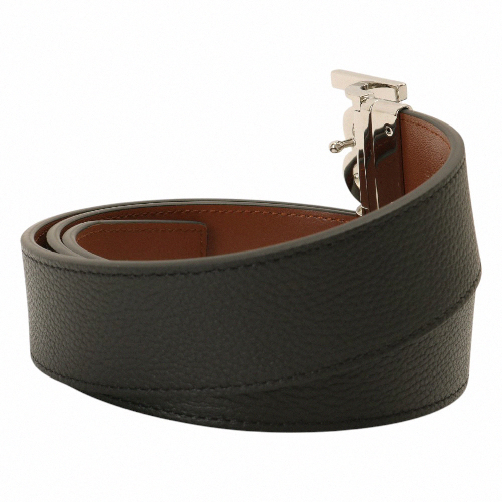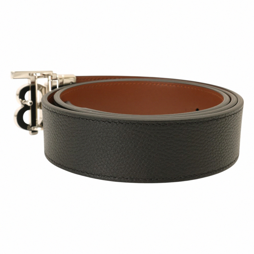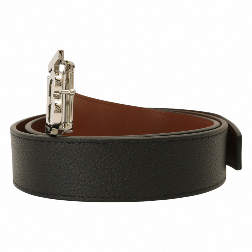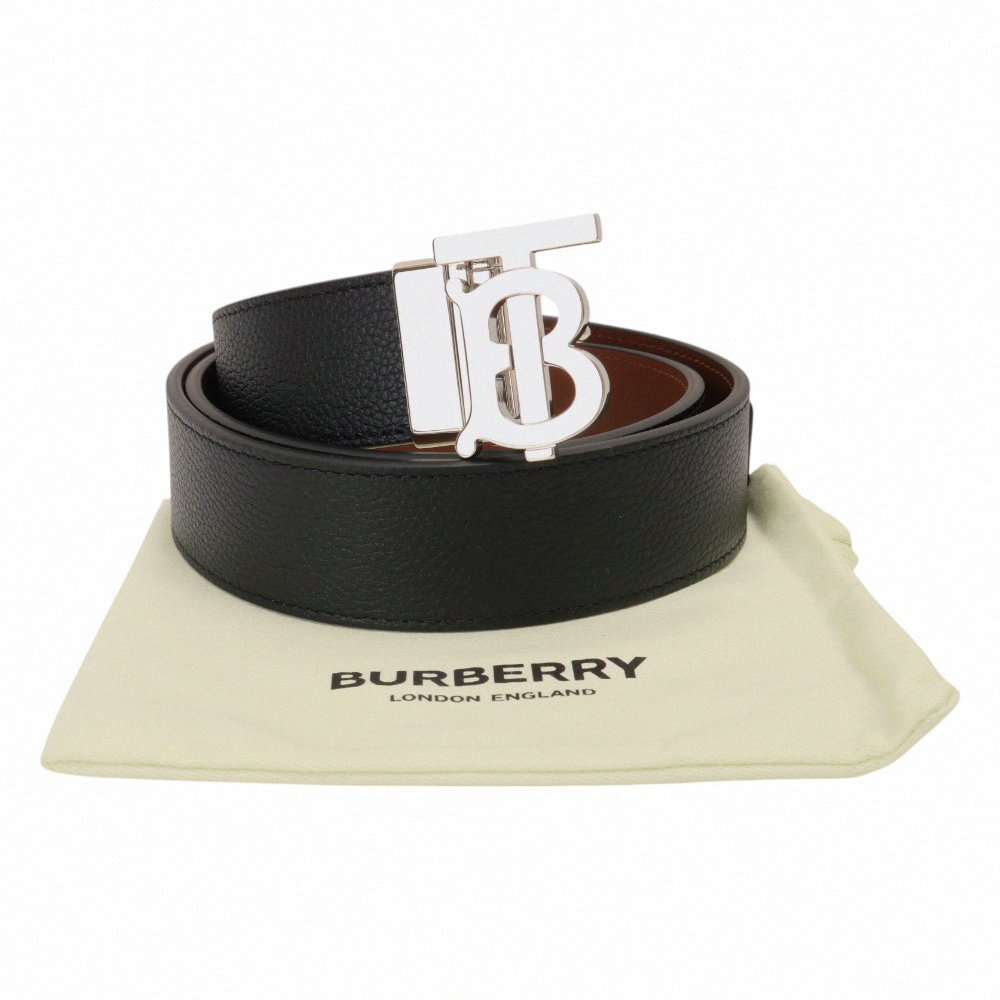 BURBERRY-金屬銀B LOGO雙面皮革男皮帶(黑x棕)105cm