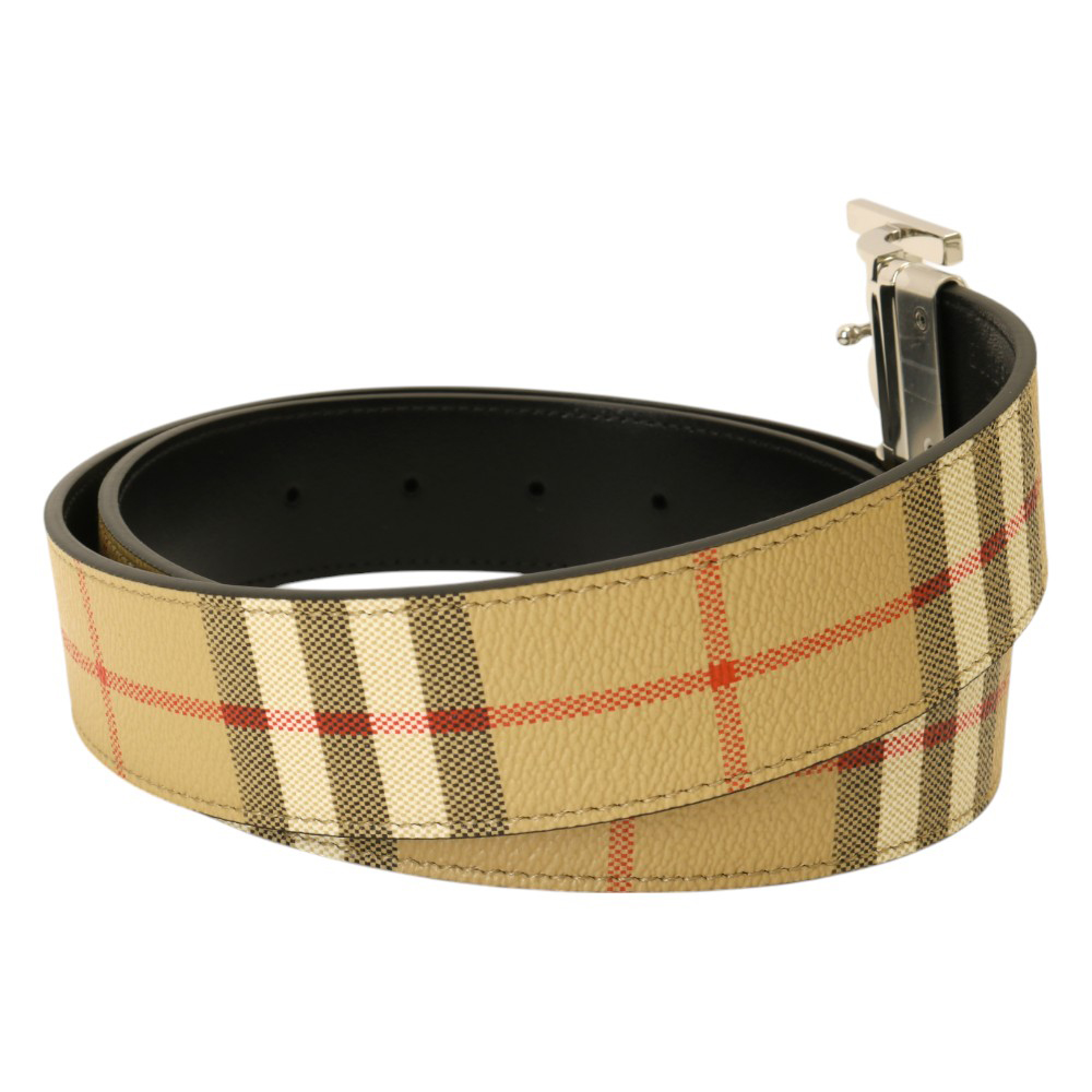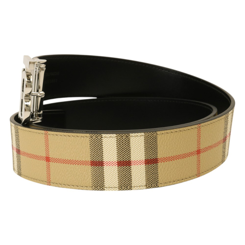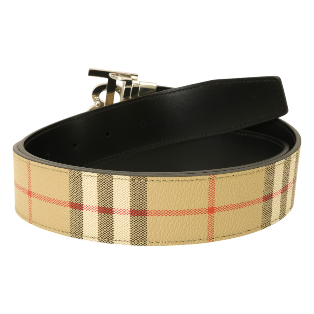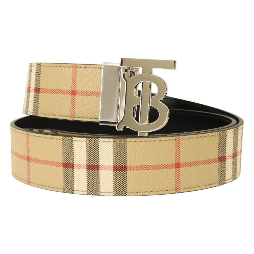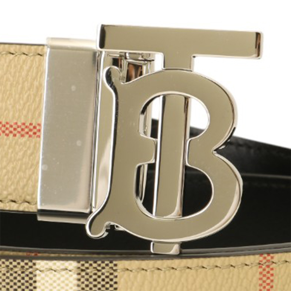 BURBERRY-金屬銀B LOGO 格紋拼皮革雙面皮帶(卡其)100cm