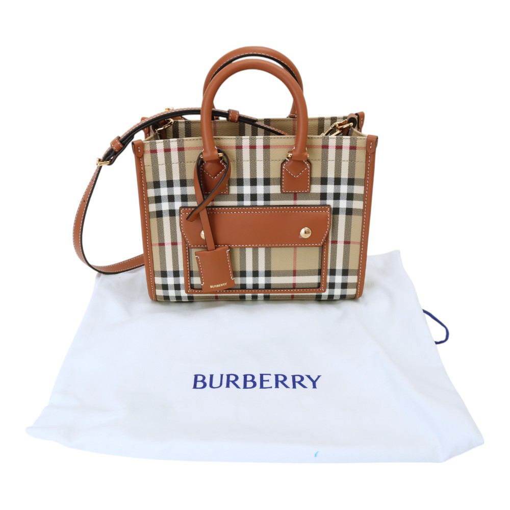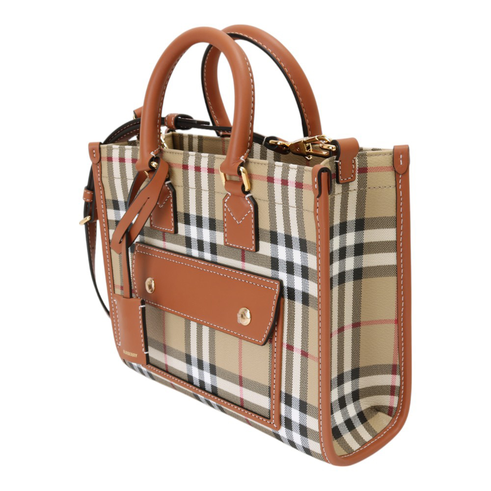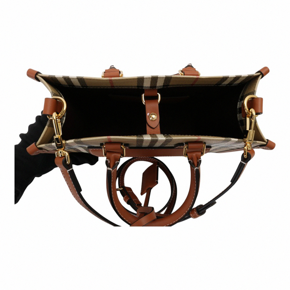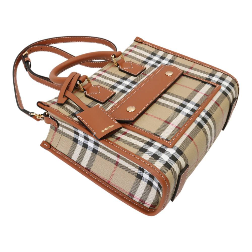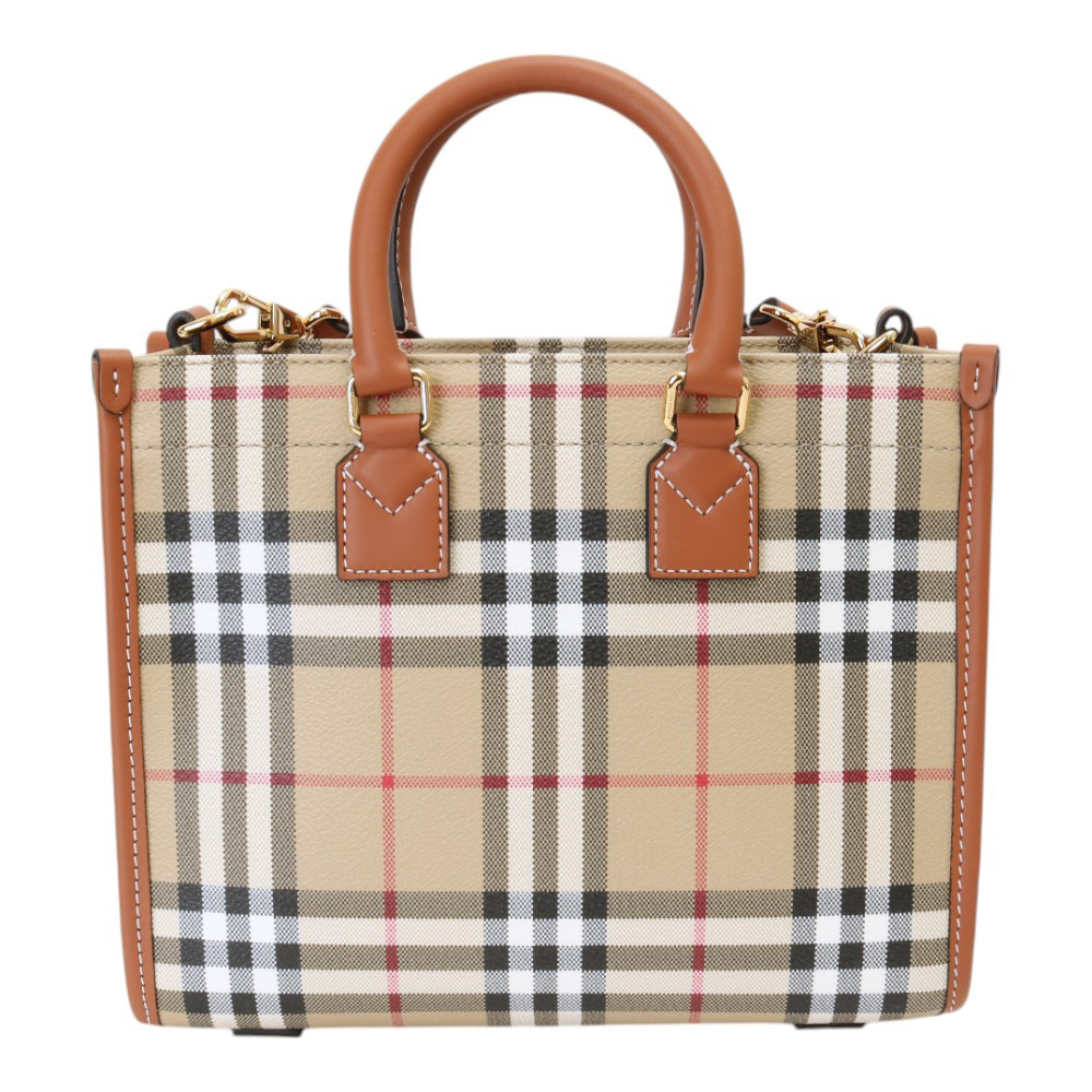 BURBERRY-防刮PVC 格紋暗釦兩用包(卡其x駝邊)mini