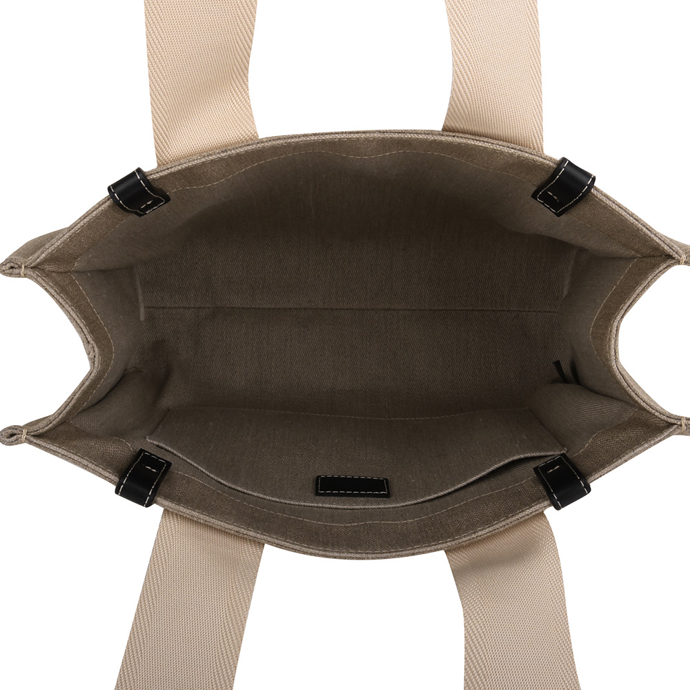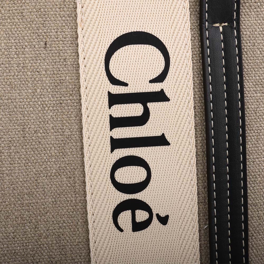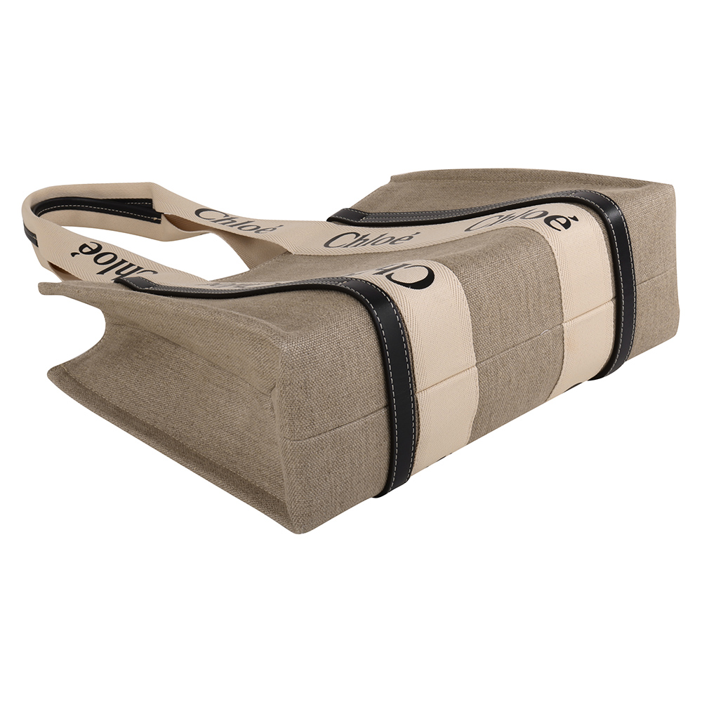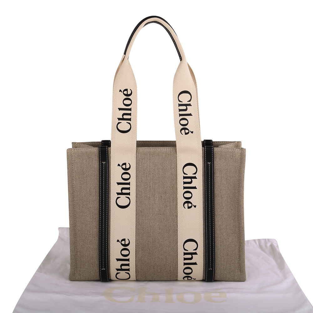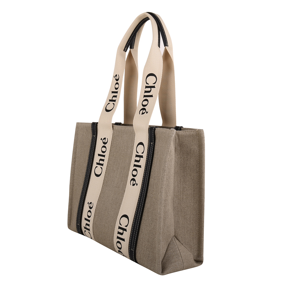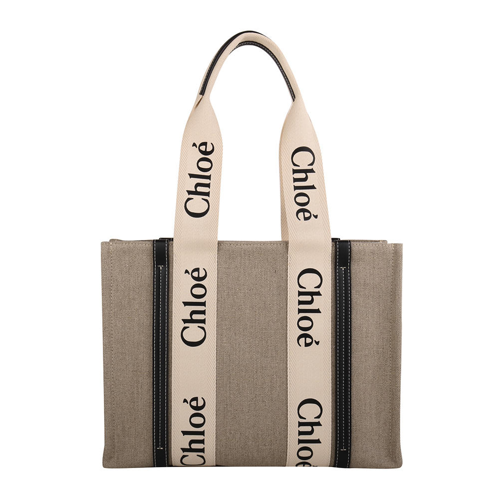 CHLOE-WOODY 條槓字母帆布托特包(卡其x墨藍)L