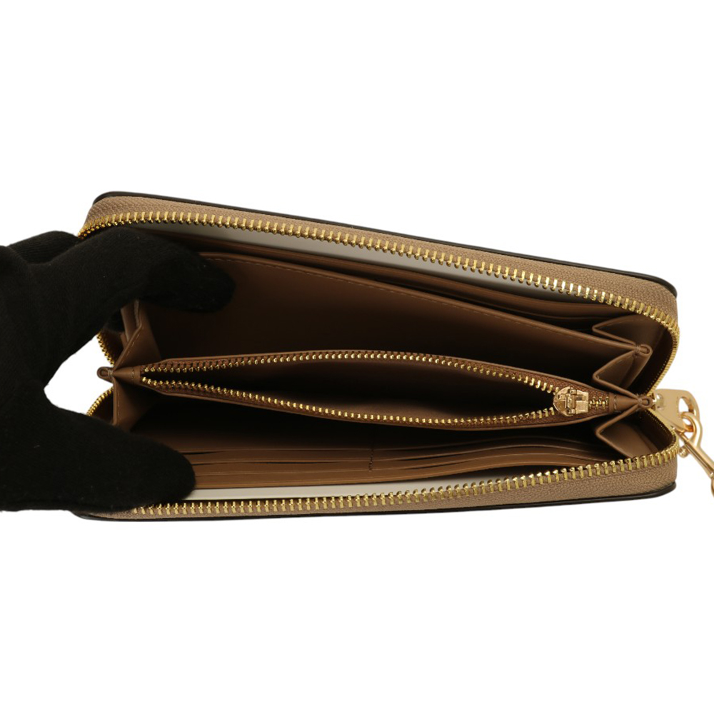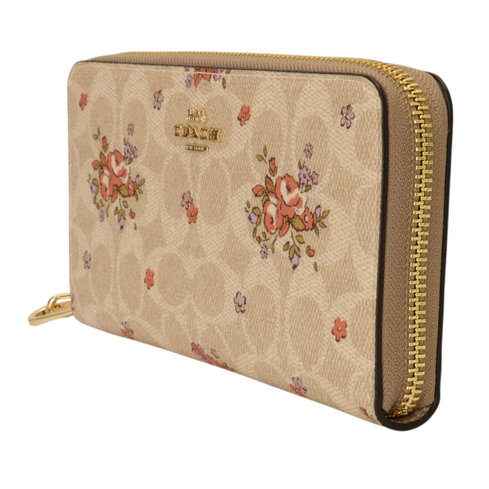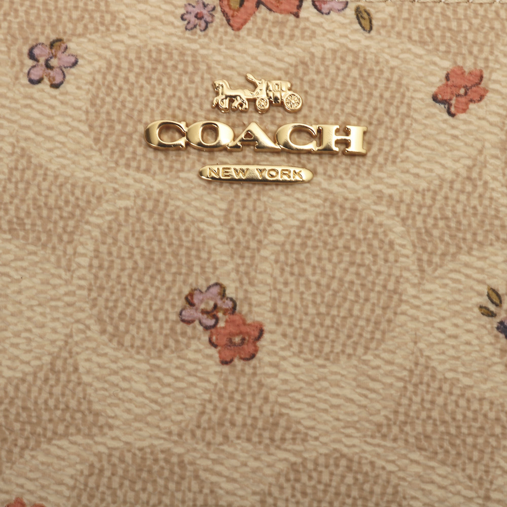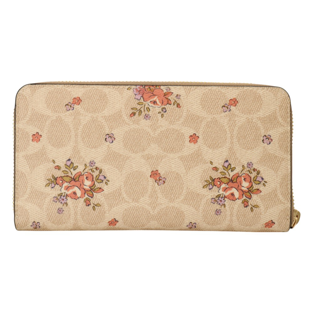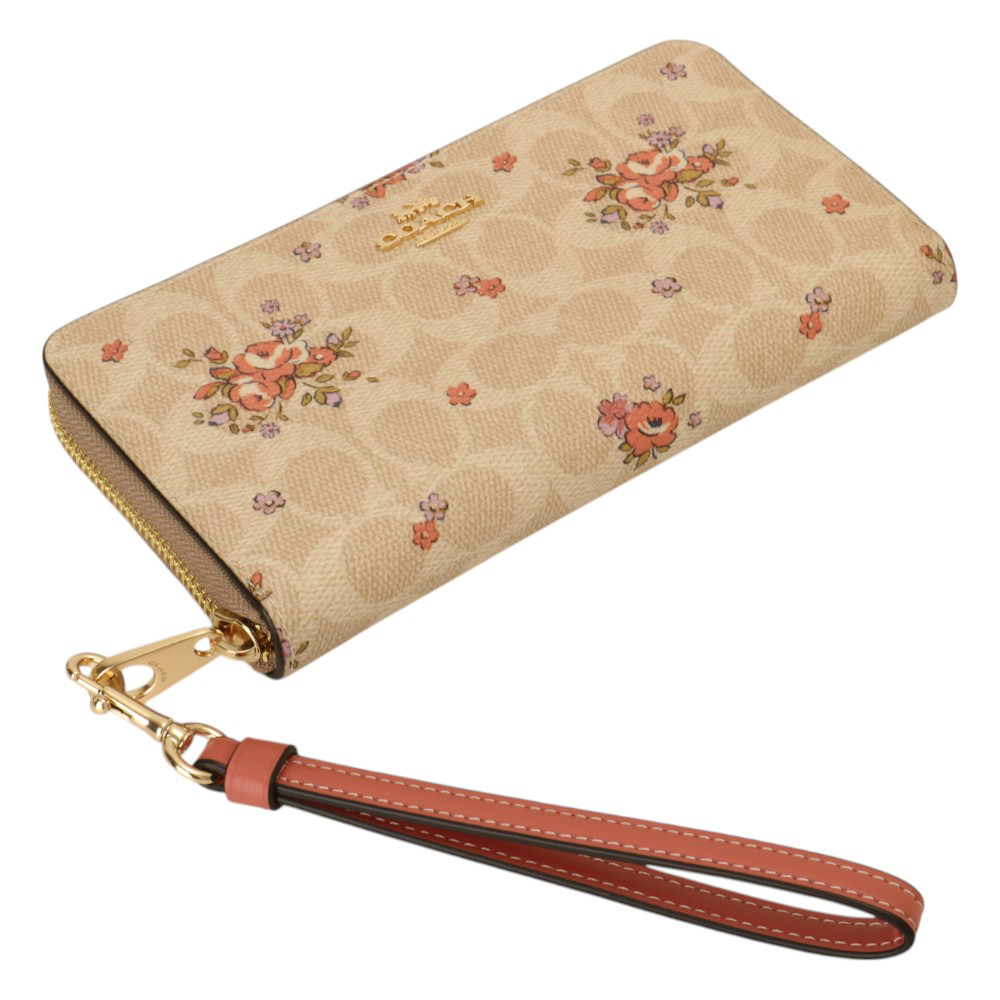 COACH 花朵圖案防刮LOGO掛帶拉鍊長夾(淺卡其x粉帶)