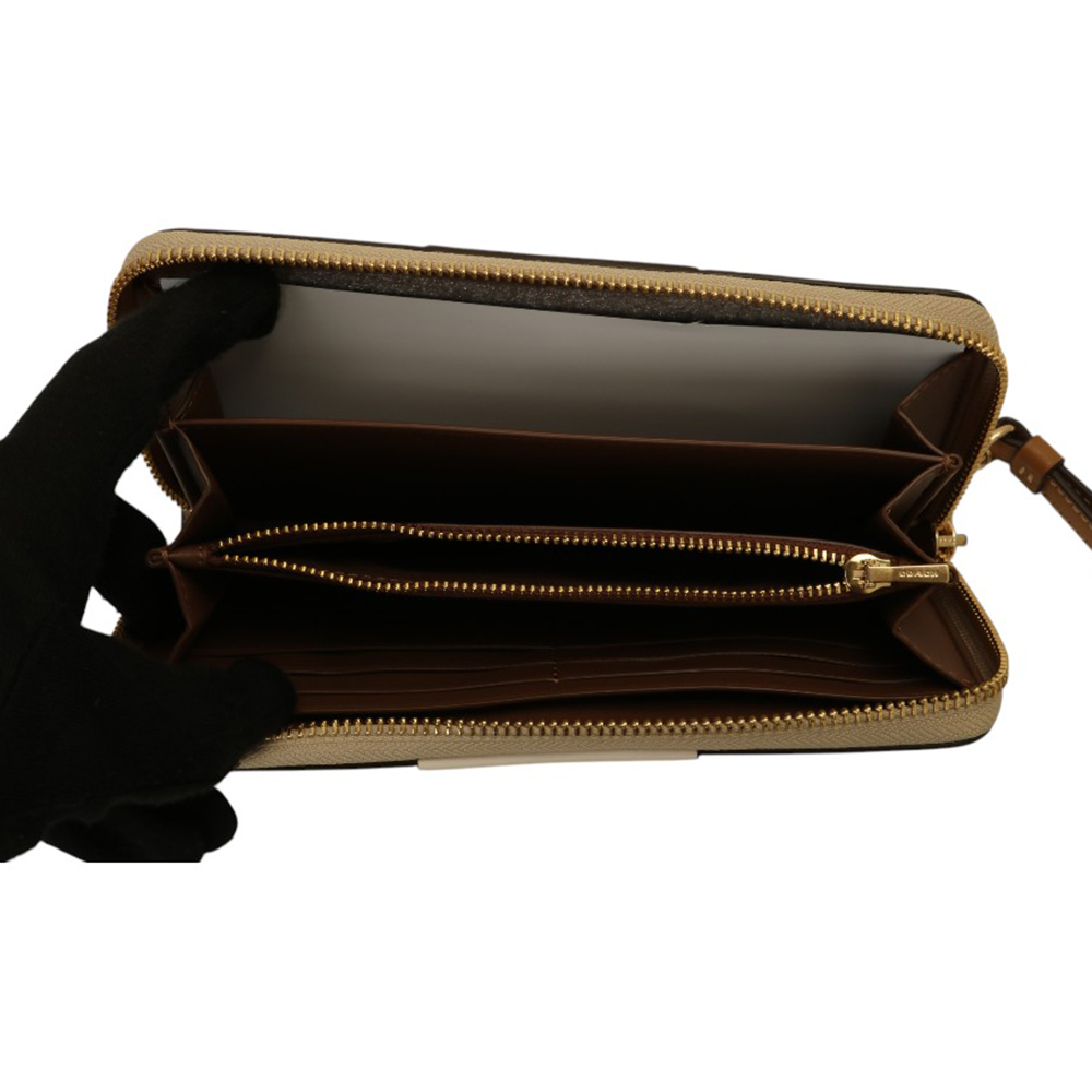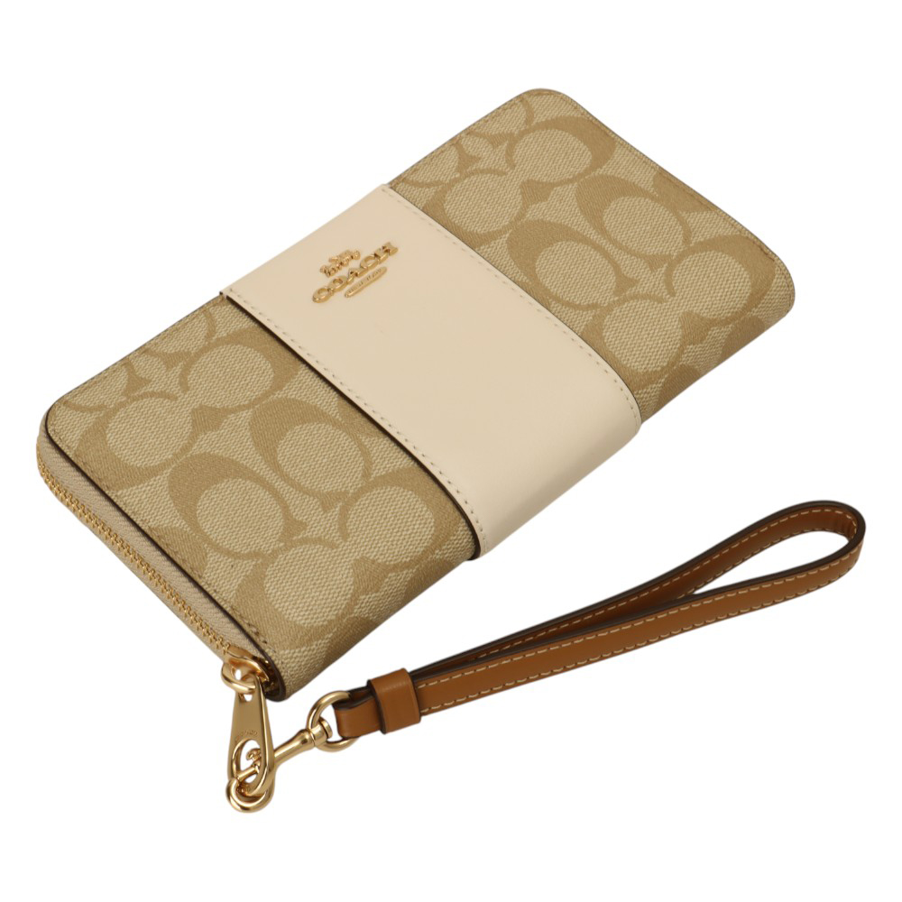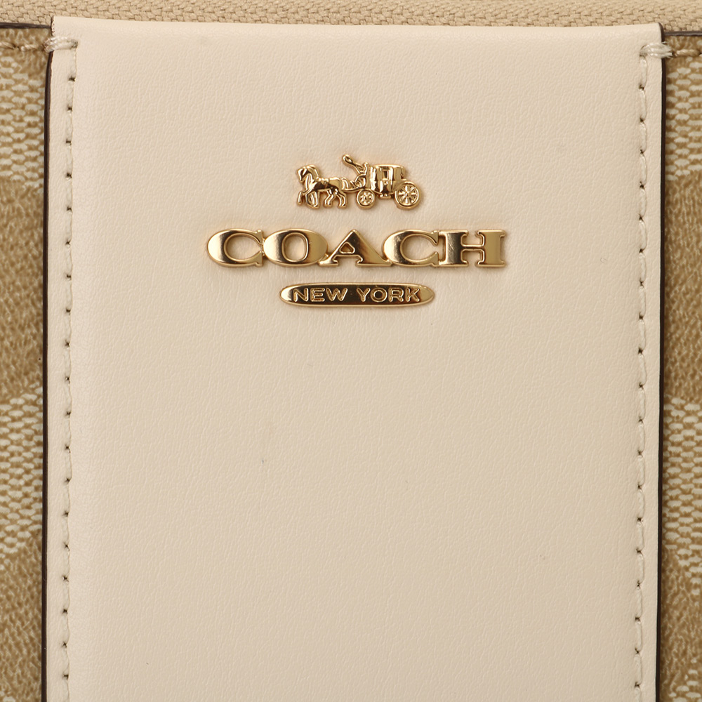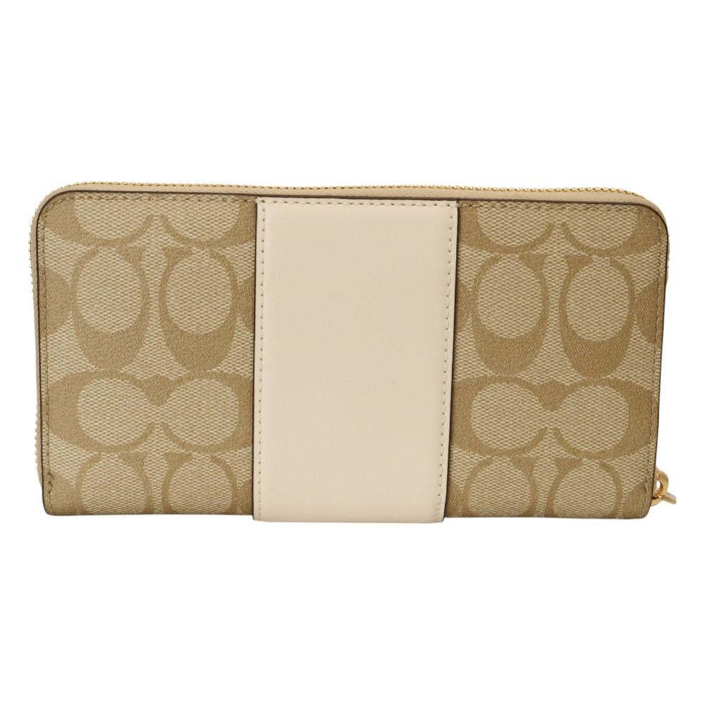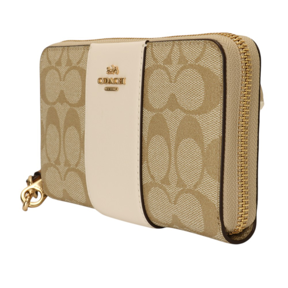 COACH 金屬馬車荔枝紋皮革掛帶拉鍊長夾(淺卡其x白槓)