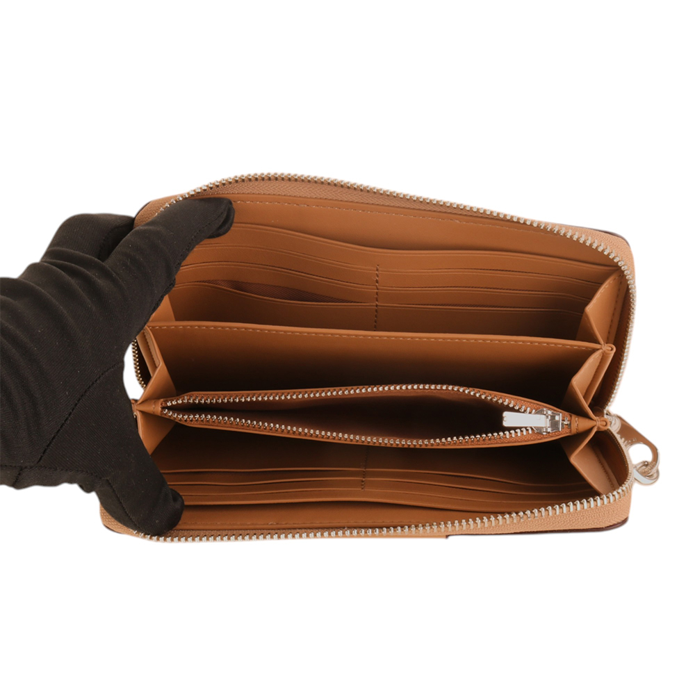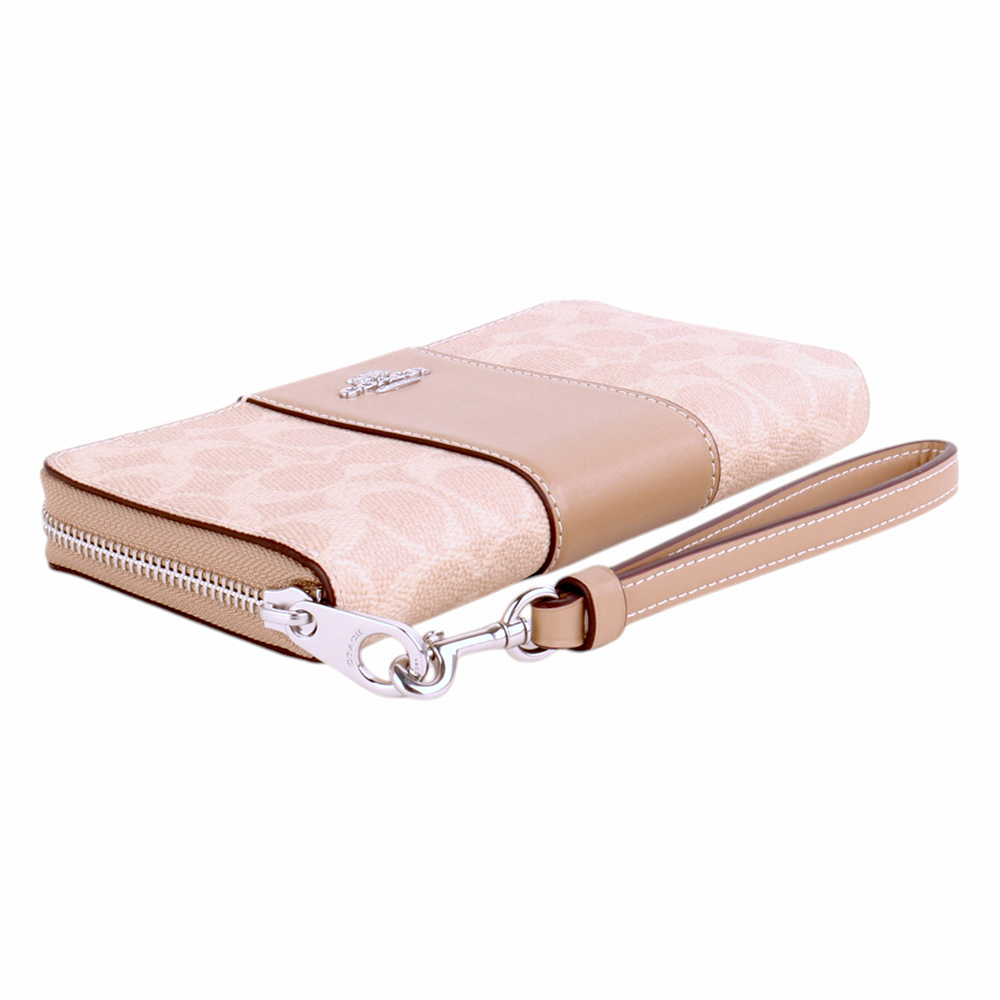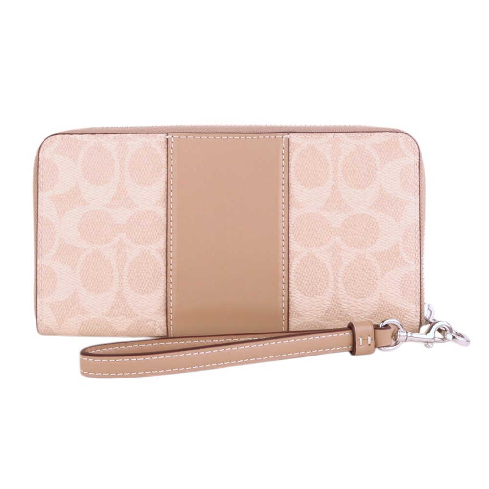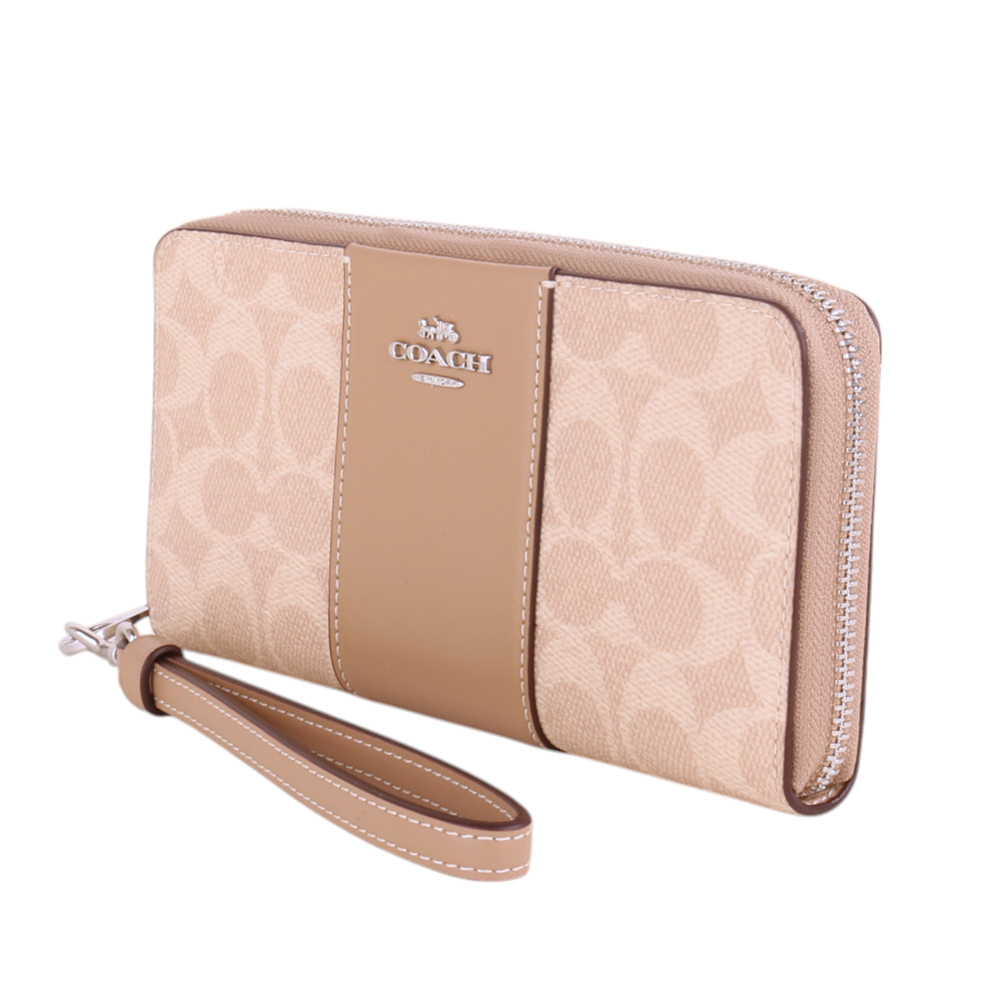 COACH 金馬車防刮LOGO皮革拉鍊掛帶長夾(淺卡其x膚)