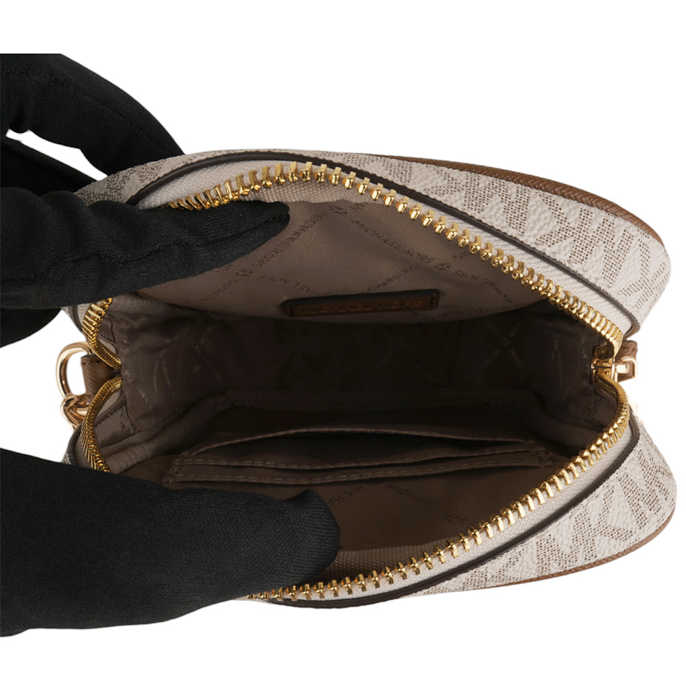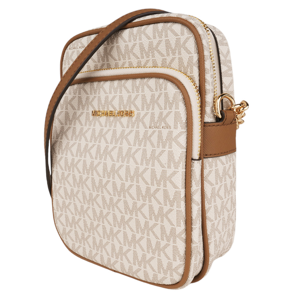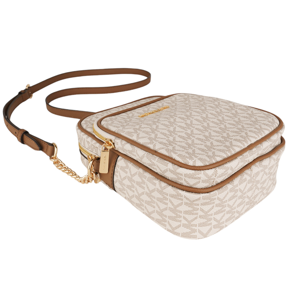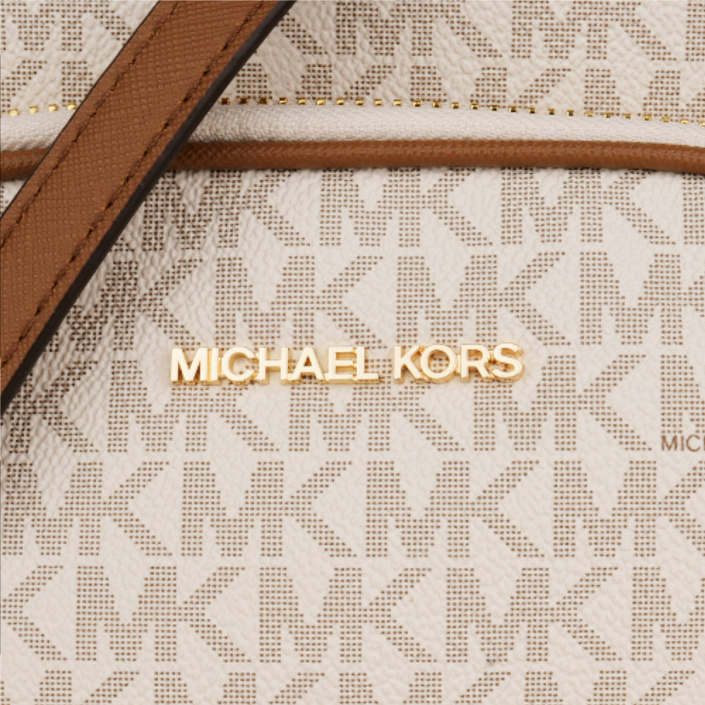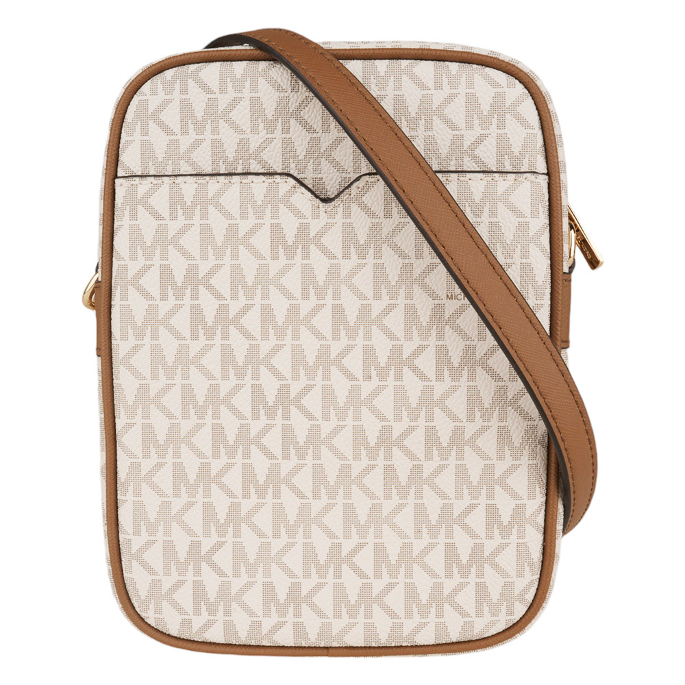 MICHAEL KORS- 金字滿版MK 防刮斜背航空包 白x駝/小
